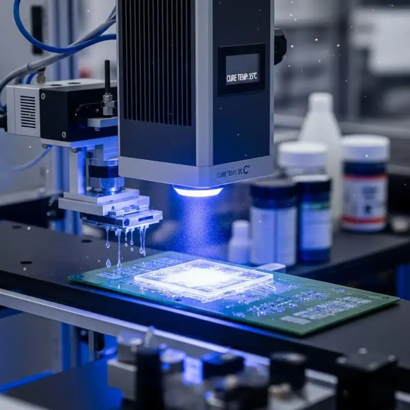 • Sấy khô keo và mực in (UV Curing): Các loại keo dán chip, mực in mã vạch trên PCB hoặc lớp phủ bảo vệ (Conformal Coating) cần một mức năng lượng UV chuẩn để khô.