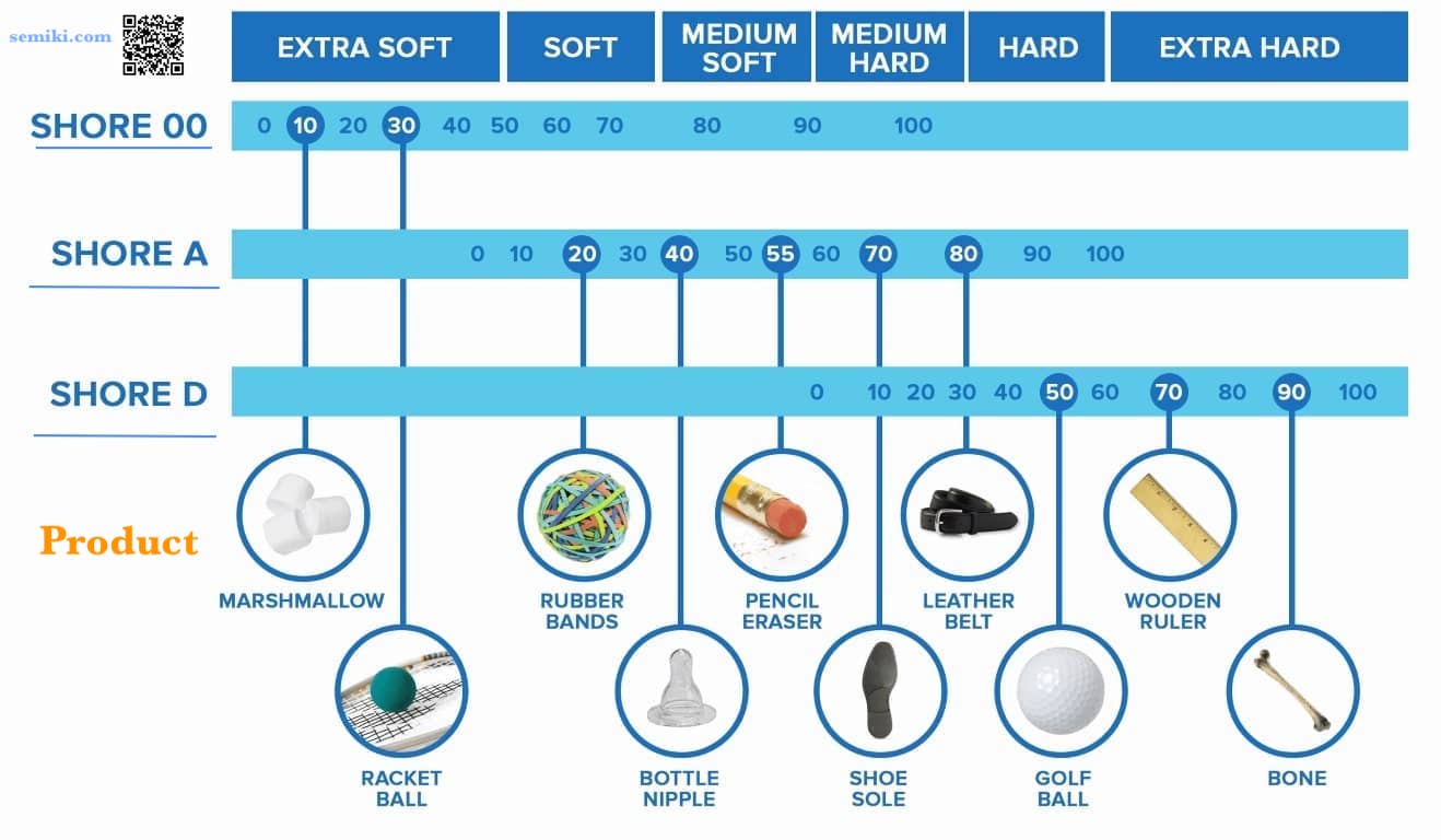 - ショアA: 最も一般的な尺度。 軟質ゴム、天然ゴム シリコンなどのエラストマー。例としては、タイヤやゴム製ガスケットなどが挙げられます。