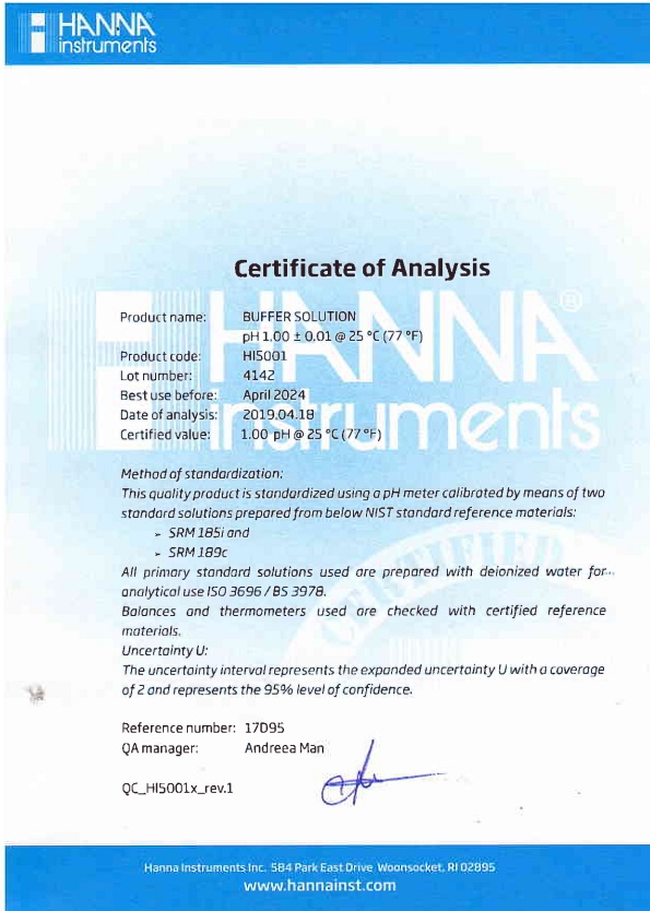 HI5001 là dung dịch đệm hiệu chuẩn 1.00 độ pH chất lượng cao được sản xuất theo tiêu chuẩn ISO 3696 / BS3978 sử dụng muối có độ tinh khiết cao, nước khử ion, cân bằng kiểm tra trọng lượng được chứng nhận và thủy tinh loại A trong môi trường được kiểm soát nhiệt độ được theo dõi bằng nhiệt kế được chứng nhận. Các giá trị được báo cáo là chính xác đến ± 0.01 pH @ 25°C và có thể truy nguyên theo Tài liệu tham khảo tiêu chuẩn (SRM) của NIST.