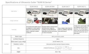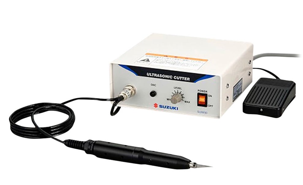 The Suzuki Ultrasonic Cutter SUW-30CTL is used for precise, clean cutting of various engineered materials, particularly in industrial settings like automotive and electronics manufacturing. It achieves a smooth and beautiful cut edge by using high-frequency ultrasonic vibrations, requiring minimal force