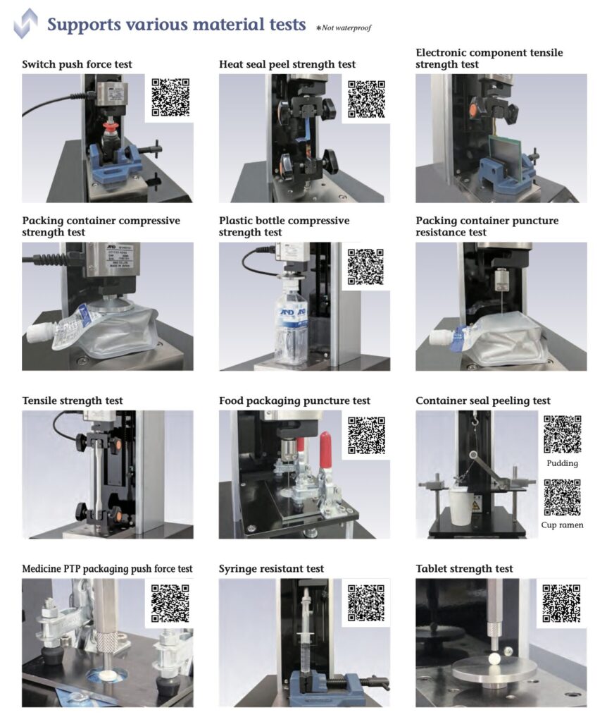• Khả năng mở rộng mạnh mẽ: A&D cung cấp hệ thống kẹp (grips), đồ gá và cảm biến đo giãn dài (extensometer) cực kỳ phong phú, phù hợp cho mọi loại vật liệu từ màng nhựa mỏng đến kim loại cứng.